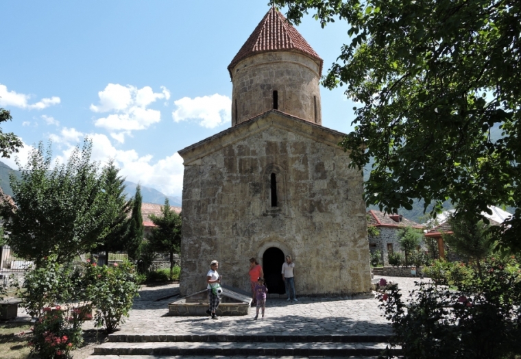 -Eramızın I əsrində Qafqaz Albaniyasında geniş yayılan Ay məbədinin özülü üzərində qurulan Kiş məbədi bütün Qafqazda təqribən 2 min il bundan əvvəl xristianlığın yayıldığını rəmzləşdirən məşhur tarixi abidədir. Əhəng daşından tikilən bu abidə erkən orta əsrlərdə yaranan ilk günbəzli, zal tipli məbəddir. 2001-ci ilin mayında abidədə Azərbaycan-Norveç birgə “Kiş” layihəsi üzrə bərpa işlərinə başlanılıb və 2003-cü ilin sentyabrında məbədin açılışı olub. Layihə məşhur norveçli səyyah, etnoqraf və alim Tur Heyerdalın dəstəyi ilə reallaşdırılıb. Alimin xatirəsini əbədiləşdirmək üçün məbədin qarşısında onun büstü da qoyulub.